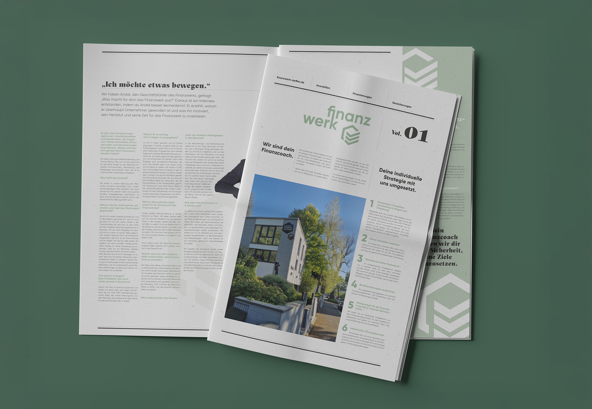 Für das Finanzwerk haben wir ihr Erscheinungsbild komplett neu überdacht und entwickelt – vom Logo-Redesign bis zum durchgängigen Corporate Design. Das Unternehmen vereint Immobilien, Finanzierung und Versicherung unter einem Dach – und genau diese Stärke sollte sich auch im Markenauftritt widerspiegeln: klar, modern, flexibel einsetzbar und überall wiedererkennbar.
